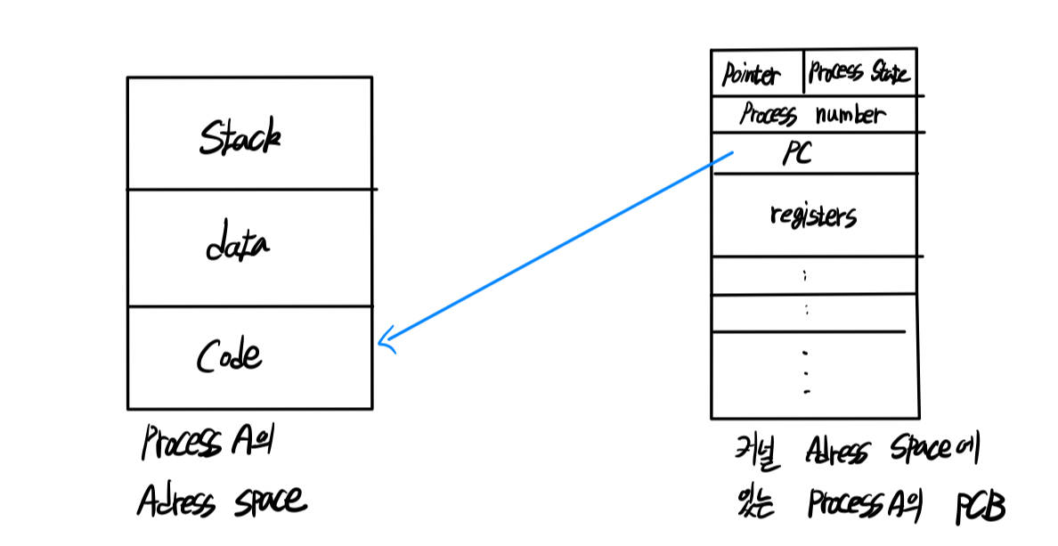 - 프로세스 A의 주소공간이 좌측 그림처럼 있고, 프로세스 A의 PCB가 우측 그림처럼 있다.