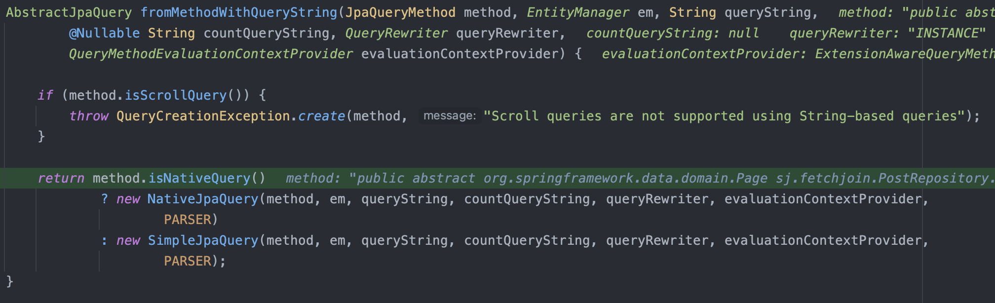 JpaQueryLookupStrategy를 지나, AbstractStringBasedJpaQuery 에서 위와 같이 카운트 쿼리가 나오는 것을 확인할 수 있다.